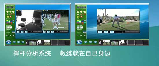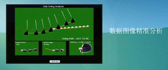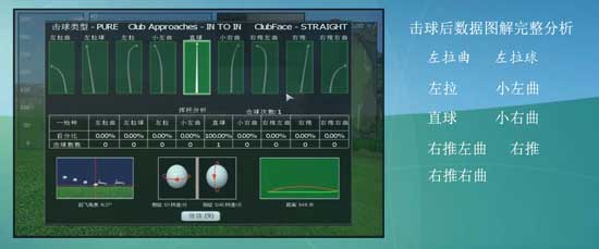 在练习中每一杆的数据包括距离、方向、转角、落点、弹跳、杆头、杆接触面、球旋转、起飞角度、左右曲线、左曲球、右曲球等等都以最直观的文字图片展现给球手,不用请教练都可以对自己错误的挥杆姿势加以纠正。